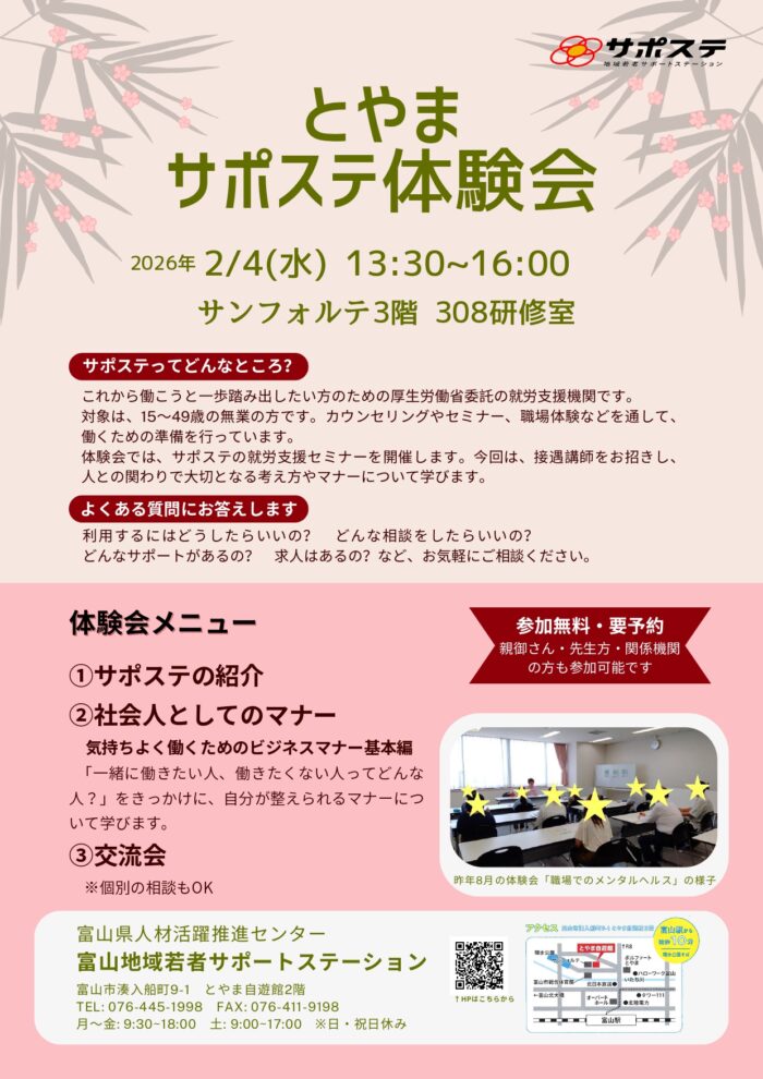 【働く準備】R8年2/4 とやまサポステ体験会のご案内